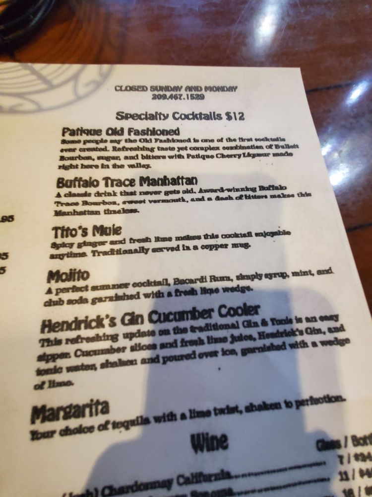 Some people say the Old Fashioned is one of the first cocktails ever created. Refreshing taste yet complex combination of Bulleit Bourbon, sugar, and bitters with Patique Cherry Liqueur made right here in the valley